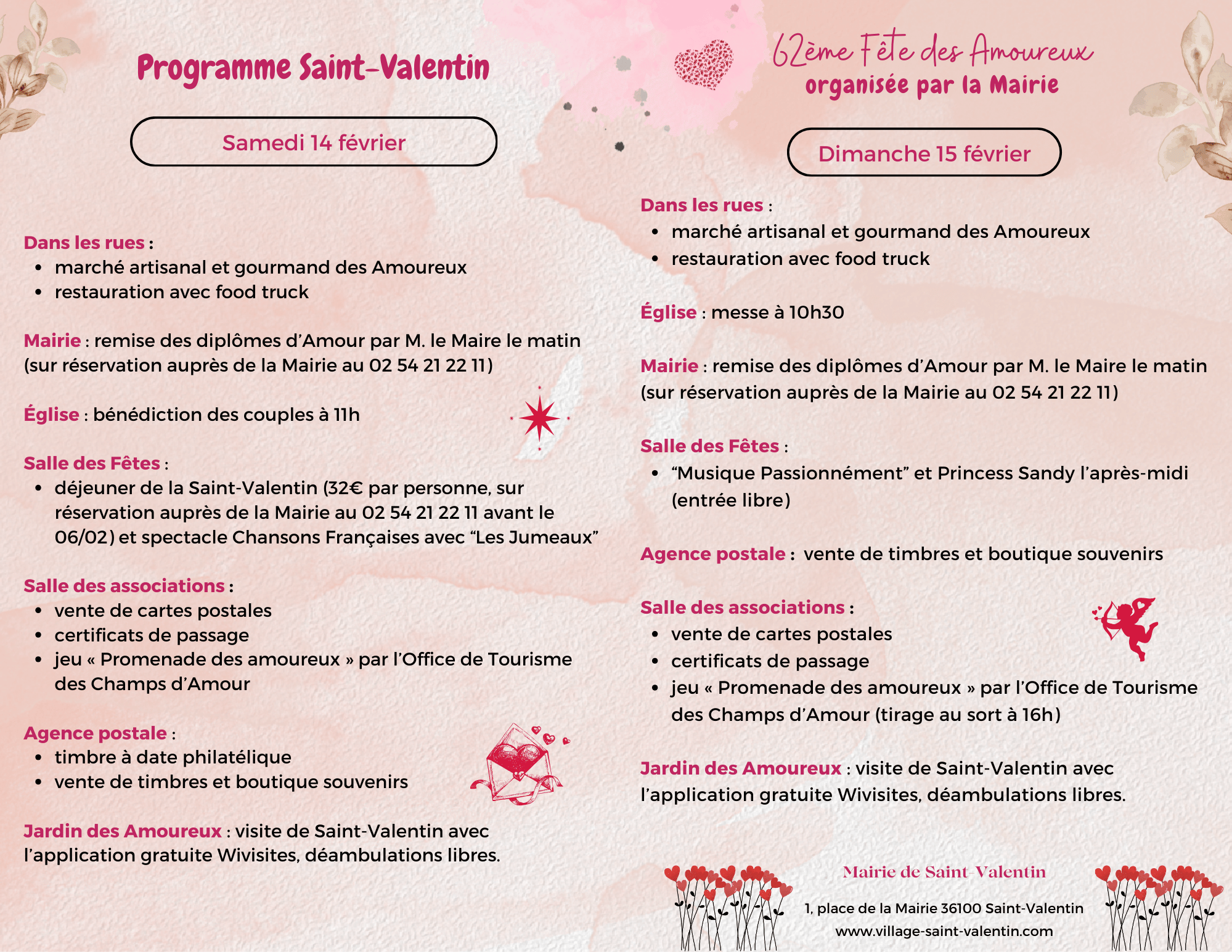 N'hésitez pas à contacter la Mairie de Saint-Valentin pour exposer sur le marché, vous inscrire au déjeuner du samedi 14 et réserver pour la remise d'un diplôme d'Amour avec M. le Maire : 02 54 21 22 11